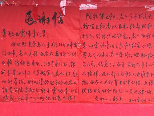 这封毛笔手写感谢信共两页,为大红色纸张,感谢对象为我院2012级学子贾伟童、睢丽拾金不昧,以行动诠释“诚信做人”。作为经管学子,应学习榜样事迹,传播拾金不昧精神,贯彻诚实守信原则。
