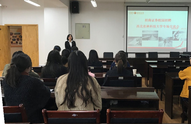 田经理与同学们的交流方式十分独特,现场气氛比较融洽,她在宣讲会开始前提出了两个问题——“想要怎么样的第一份工作?对未来的期待是什么?”,问题的提出引发了在场同学们的深刻思考,同学们就相关问题进行交流,从侧面对学生进行了解。随后,田经理从招商证券的创始年份、发展历程、人才水平及客户规模等方面系统的为同学们进行介绍,与此同时,田经理从价值、专业、创新、梦想四个方面向2018届毕业生展示了招商证券特有的创新模式及人才培养计划,使同学们加深了对招商证券的了解。