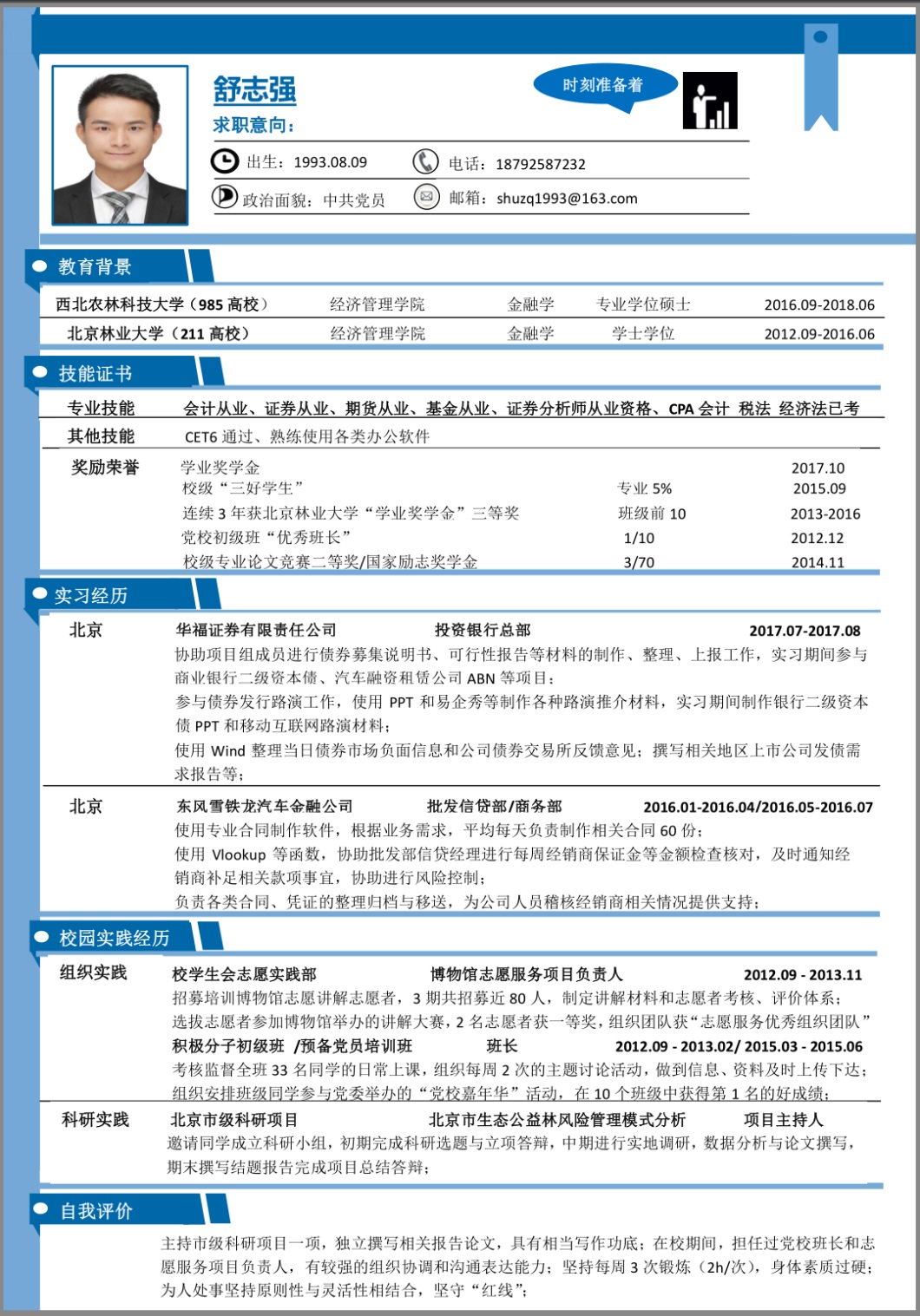 个人简介:舒志强,2016级金融专业硕士,在校期间多次获得奖学金,先后考取了会计从业、证券从业、期货从业、基金从业、证券分析师从业资格。