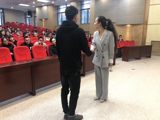 本次会议分为礼、尚、网、来、沟通五项内容。会议伊始,张梦楚提出五个 “我是什么”的问题,她强调:“人生要先活出宽度,在活出深度和长度。并且在与考官的互动过程中一定要扬长避短,体现个人价值并且要注重团队精神。”随后,张梦楚与学生进行友好互动,让每位同学在纸上画出与自己最相符的动物形象,并与周围同学分享,以此锻炼交流沟通的能力。她指出:“仪表、仪态、仪容都是应聘的关键所在。面试不能生搬硬套,而应与实际相结合,要学会灵活应变各种突发情况,才能赢得用人单位的青睐。”接着,她亲切地与同学们交流优雅的自我介绍礼仪公式,并要求与会男生和女生分别起立,练习站姿和迎宾体态。张梦楚以身作则、认真指导,同学们受益匪浅。