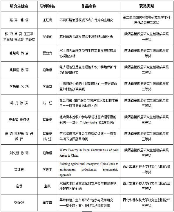 ——第二届全国农林院校研究生学术科技作品竞赛二等奖1项。2018年12月7日,由中国学位与研究生教育学会农林学科工作委员会主办,南京农业大学和南京林业大学承办的第二届全国农林院校研究生学术科技作品决赛在南京农业大学瀚苑宾馆顺利召开,我院研究生惠涛等作为唯一入围团队,代表我校参加本次决赛。竞赛以“激发创新驱动,推动人才培养,增强社会服务,助力乡村振兴”为宗旨,经评委现场评审,惠涛等人完成的《不同环境治理模式下农户行为研究》喜获二等奖。