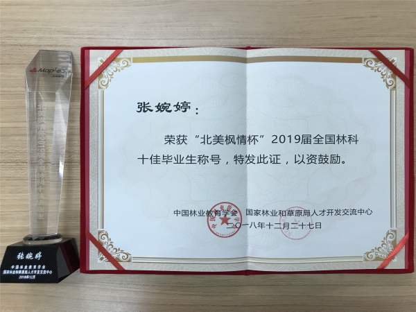 近日,由中国林业教育学会、国家林业和草原局人才开发交流中心主办的“北美枫情杯”2019届全国林科十佳毕业生评选活动颁奖典礼在安徽农业大学举行。我校共有11名同学从全国300多所涉林院校415名候选人脱颖而出,获奖人数在所有参评高校和科研院所中位列第2。