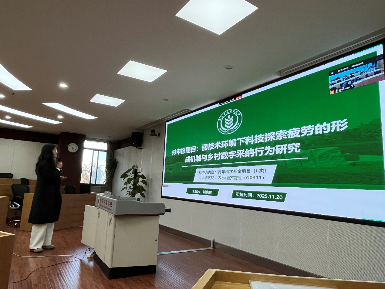报告结束后,进入青年教师汇报与交流环节。西部农村发展研究中心党支部两位青年教师黄腾、赵爽爽依次围绕各自拟申报的基金选题进行了汇报,从选题、研究背景、研究思路、研究内容等方面作了详细介绍。两位老师在汇报中不仅展示了各自的研究方向和学术积累,也提出了在选题聚焦度、创新点提炼、方法路径设计等方面的困惑和思考。