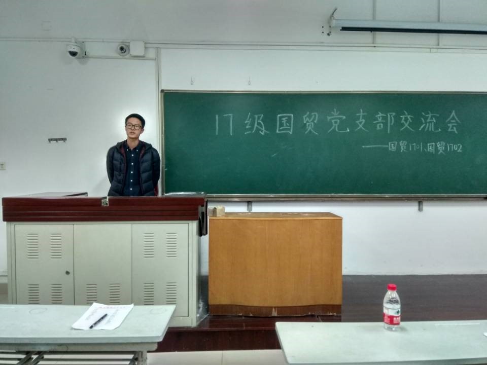 为了充分发挥党组织在班级工作整体规划和学生成长中的思想指导功能,帮助同学们更好的规划大学生活,树立明确的目标,在辅导员老师倡议下,11月28日晚上在北校N8117教室,17级国贸专业召开党支部交流会。交流会邀请国贸党支部党员常丽颖学姐、钱峥学姐、王正洋学长、王立成和苏金平学长参加,由国贸1701班团支书王小凤、1702班团支书白健主持。