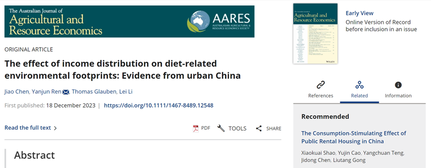 近日,任彦军教授作为通讯作者在The Australasian journal of Agricultural and Resource Economics期刊上发表最新研究成果“The effect of income distribution on diet-related environmental footprints: Evidence from urban China”.