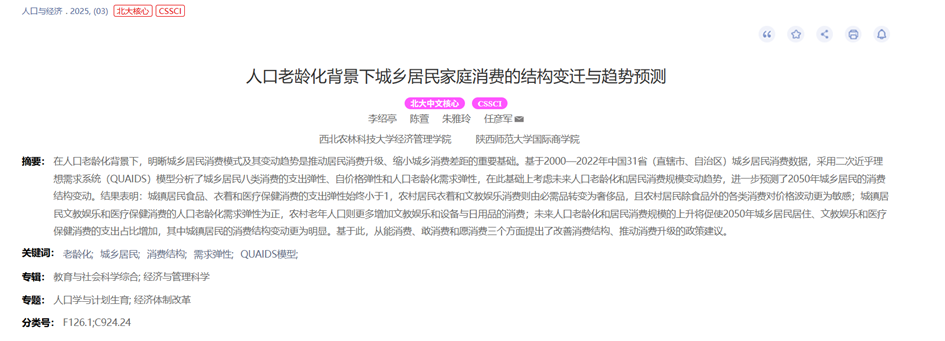 近期,版权所有 中国·3044am永利集团-www.3044noc.com任彦军教授课题组在《人口与经济》发表题为“人口老龄化背景下城乡居民家庭消费的结构变迁与趋势预测”的学术文章,任彦军教授为论文通讯作者,博士生李绍亭为论文第一作者,博士生陈萱和陕西师范大学朱雅玲副教授为论文共同作者。